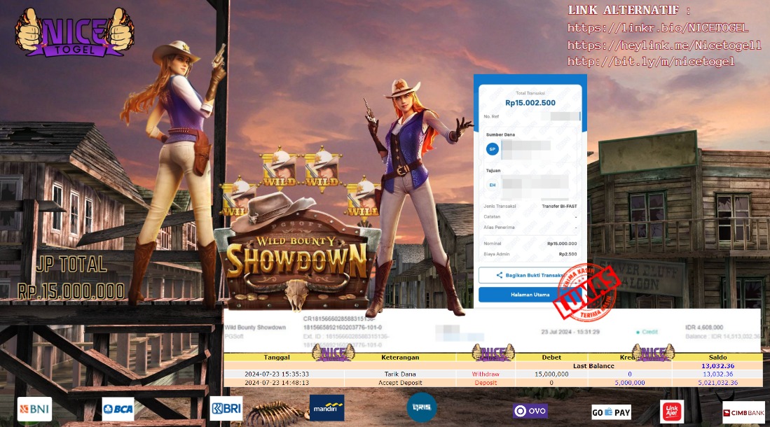 Selamat kepada User id : Youi** Telah berhasil mendapatkan kemenangan besar pada permainan WILD BOUNTY SHOWDOWN Dengan kemenangan Sebesar Rp.15.000.000,- Setelah mengisi formulir withdraw dengan kurung waktu hanya 5 – 10 menit pihak NICETOGEL sudah melakukan transfer kepada pemilik Userid dan dana sudah dapat di cairkan oleh pemenang. Bukti pembayaran yang kami berikan merupakan bukti pembayaran yang SAH / VALID yang langung di dapatkan melaui tanda transfer transaksi dari Bank yang di tuju.