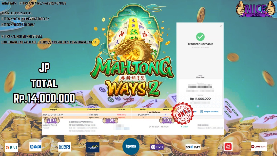 Selamat kepada User id : Oli** Telah berhasil mendapatkan kemenangan besar pada permainan MAHYONG WAYS 2 Dengan kemenangan Sebesar Rp.14.000.000,- Setelah mengisi formulir withdraw dengan kurung waktu hanya 5 – 10 menit pihak NICETOGEL sudah melakukan transfer kepada pemilik Userid dan dana sudah dapat di cairkan oleh pemenang. Bukti pembayaran yang kami berikan merupakan bukti pembayaran yang SAH / VALID yang langung di dapatkan melaui tanda transfer transaksi dari Bank yang di tuju.