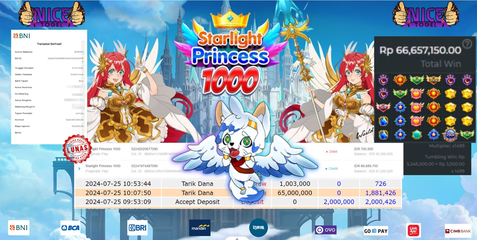 Selamat kepada User id : yudin** Telah berhasil mendapatkan kemenangan besar pada permainan STARLIGHT PRINCESS 1000 Dengan kemenangan Sebesar Rp. 66.657.000,- Setelah mengisi formulir withdraw dengan kurung waktu hanya 5 – 10 menit pihak NICETOGEL sudah melakukan transfer kepada pemilik Userid dan dana sudah dapat di cairkan oleh pemenang. Bukti pembayaran yang kami berikan merupakan bukti pembayaran yang SAH / VALID yang langung di dapatkan melaui tanda transfer transaksi dari Bank yang di tuju.