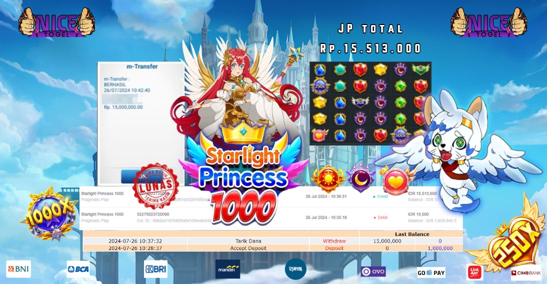 Selamat kepada User id : DOPE** Telah berhasil mendapatkan kemenangan besar pada permainan STARLIGHT PRINCESS 1000 Dengan kemenangan Sebesar Rp.15.513.000,- Setelah mengisi formulir withdraw dengan kurung waktu hanya 5 – 10 menit pihak NICETOGEL sudah melakukan transfer kepada pemilik Userid dan dana sudah dapat di cairkan oleh pemenang. Bukti pembayaran yang kami berikan merupakan bukti pembayaran yang SAH / VALID yang langung di dapatkan melaui tanda transfer transaksi dari Bank yang di tuju.