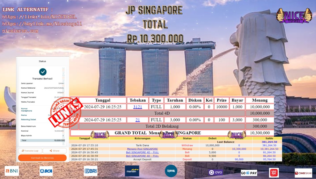 Selamat kepada User id : Ope** Telah berhasil mendapatkan kemenangan besar pada permainan TOGEL SINGAPORE Dengan kemenangan Sebesar Rp.10.300.000,- Setelah mengisi formulir withdraw dengan kurung waktu hanya 5 – 10 menit pihak NICETOGEL sudah melakukan transfer kepada pemilik Userid dan dana sudah dapat di cairkan oleh pemenang. Bukti pembayaran yang kami berikan merupakan bukti pembayaran yang SAH / VALID yang langung di dapatkan melaui tanda transfer transaksi dari Bank yang di tuju.