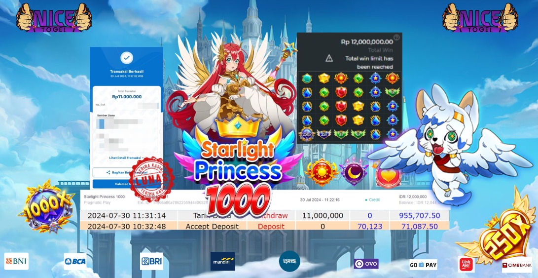 Selamat kepada User id : Puoi** Telah berhasil mendapatkan kemenangan besar pada permainan STARLIGHT PRINCESS 1000 Dengan kemenangan Sebesar Rp.12.000.000,- Setelah mengisi formulir withdraw dengan kurung waktu hanya 5 – 10 menit pihak NICETOGEL sudah melakukan transfer kepada pemilik Userid dan dana sudah dapat di cairkan oleh pemenang. Bukti pembayaran yang kami berikan merupakan bukti pembayaran yang SAH / VALID yang langung di dapatkan melaui tanda transfer transaksi dari Bank yang di tuju.