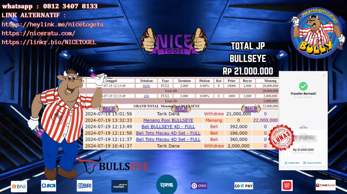 Selamat kepada User id : OIu** Telah berhasil mendapatkan kemenangan besar pada permainan TOGEL PCSO Dengan kemenangan Sebesar Rp.11.000.000,- Setelah mengisi formulir withdraw dengan kurung waktu hanya 5 – 10 menit pihak NICETOGEL sudah melakukan transfer kepada pemilik Userid dan dana sudah dapat di cairkan oleh pemenang. Bukti pembayaran yang kami berikan merupakan bukti pembayaran yang SAH / VALID yang langung di dapatkan melaui tanda transfer transaksi dari Bank yang di tuju.