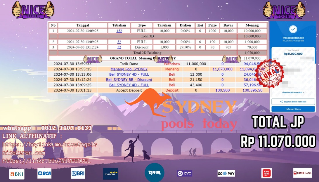 Selamat kepada User id : OPl** Telah berhasil mendapatkan kemenangan besar pada permainan TOGEL SYDNEY Dengan kemenangan Sebesar Rp.11.070.000,- Setelah mengisi formulir withdraw dengan kurung waktu hanya 5 – 10 menit pihak NICETOGEL sudah melakukan transfer kepada pemilik Userid dan dana sudah dapat di cairkan oleh pemenang. Bukti pembayaran yang kami berikan merupakan bukti pembayaran yang SAH / VALID yang langung di dapatkan melaui tanda transfer transaksi dari Bank yang di tuju.