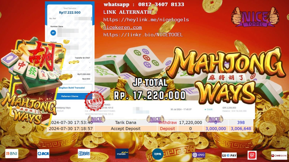 Selamat kepada User id : Kond** Telah berhasil mendapatkan kemenangan besar pada permainan MAHJONG WAYS Dengan kemenangan Sebesar Rp.17.220.000,- Setelah mengisi formulir withdraw dengan kurung waktu hanya 5 – 10 menit pihak NICETOGEL sudah melakukan transfer kepada pemilik Userid dan dana sudah dapat di cairkan oleh pemenang. Bukti pembayaran yang kami berikan merupakan bukti pembayaran yang SAH / VALID yang langung di dapatkan melaui tanda transfer transaksi dari Bank yang di tuju.