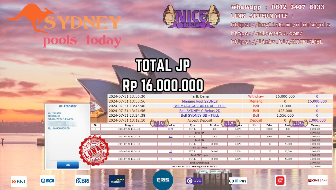 Selamat kepada User id : AWO** Telah berhasil mendapatkan kemenangan besar pada permainan TOGEL SYDNEY Dengan kemenangan Sebesar Rp.16.000.000,- Setelah mengisi formulir withdraw dengan kurung waktu hanya 5 – 10 menit pihak NICETOGEL sudah melakukan transfer kepada pemilik Userid dan dana sudah dapat di cairkan oleh pemenang. Bukti pembayaran yang kami berikan merupakan bukti pembayaran yang SAH / VALID yang langung di dapatkan melaui tanda transfer transaksi dari Bank yang di tuju.