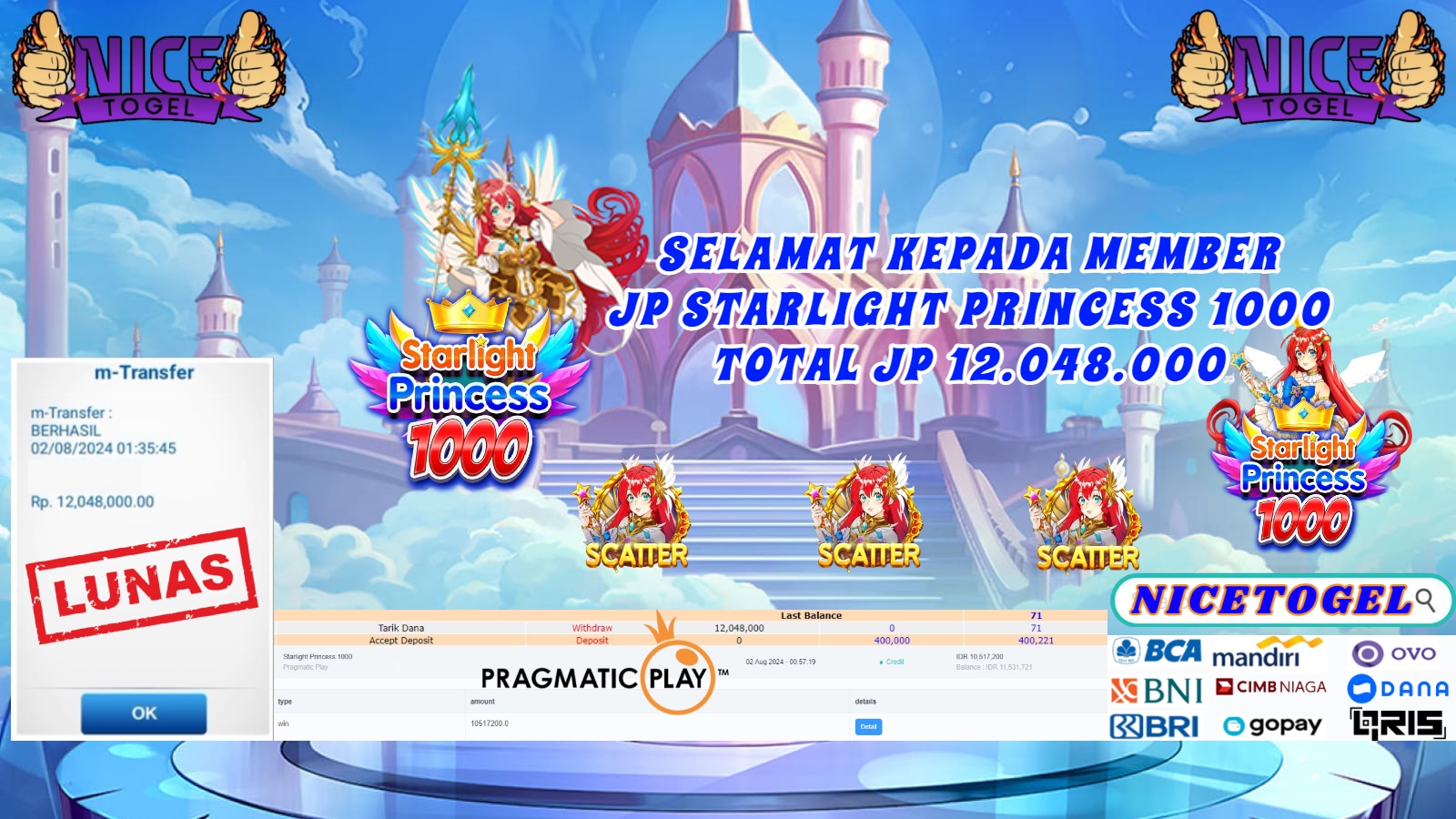 Selamat kepada User id : iky***18 Telah berhasil mendapatkan kemenangan besar pada permainan SLOT STARLIGHT PRINCESS 1000 Dengan kemenangan Sebesar Rp.12.048.000,- Setelah mengisi formulir withdraw dengan kurung waktu hanya 5 – 10 menit pihak NICETOGEL sudah melakukan transfer kepada pemilik Userid dan dana sudah dapat di cairkan oleh pemenang. Bukti pembayaran yang kami berikan merupakan bukti pembayaran yang SAH / VALID yang langung di dapatkan melaui tanda transfer transaksi dari Bank yang di tuju.