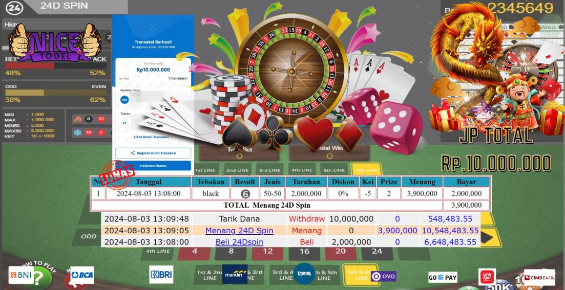 Selamat kepada User id : Opi** Telah berhasil mendapatkan kemenangan besar pada permainan LIVEGAME 24D SPIN Dengan kemenangan Sebesar Rp.10.000.000,- Setelah mengisi formulir withdraw dengan kurung waktu hanya 5 – 10 menit pihak NICETOGEL sudah melakukan transfer kepada pemilik Userid dan dana sudah dapat di cairkan oleh pemenang. Bukti pembayaran yang kami berikan merupakan bukti pembayaran yang SAH / VALID yang langung di dapatkan melaui tanda transfer transaksi dari Bank yang di tuju.