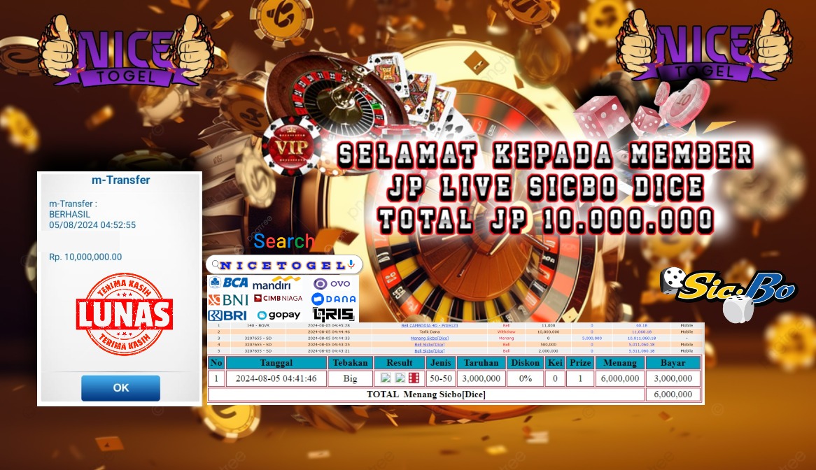 Selamat kepada User id : O** Telah berhasil mendapatkan kemenangan besar pada permainan LIVE SICBO DICE Dengan kemenangan Sebesar Rp.10.000.000,- Setelah mengisi formulir withdraw dengan kurung waktu hanya 5 – 10 menit pihak NICETOGEL sudah melakukan transfer kepada pemilik Userid dan dana sudah dapat di cairkan oleh pemenang. Bukti pembayaran yang kami berikan merupakan bukti pembayaran yang SAH / VALID yang langung di dapatkan melaui tanda transfer transaksi dari Bank yang di tuju.