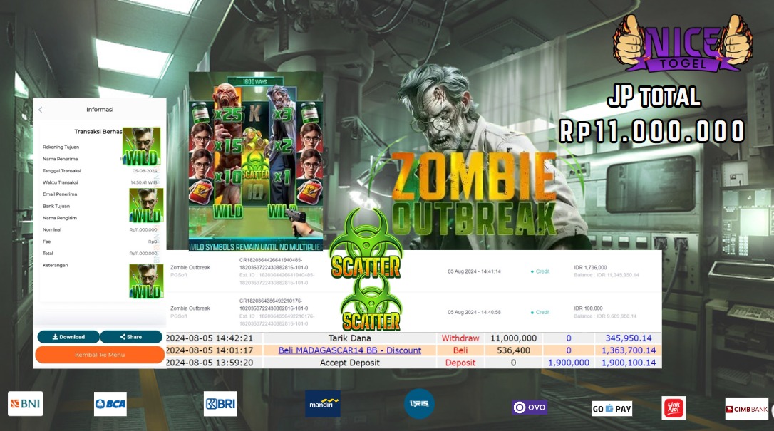 Selamat kepada User id : Pellr** Telah berhasil mendapatkan kemenangan besar pada permainan ZOMBIE OUTBREAK  Dengan kemenangan Sebesar Rp.11.000.000,- Setelah mengisi formulir withdraw dengan kurung waktu hanya 5 – 10 menit pihak NICETOGEL sudah melakukan transfer kepada pemilik Userid dan dana sudah dapat di cairkan oleh pemenang. Bukti pembayaran yang kami berikan merupakan bukti pembayaran yang SAH / VALID yang langung di dapatkan melaui tanda transfer transaksi dari Bank yang di tuju.