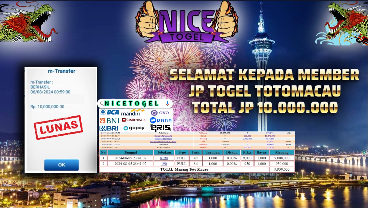 Selamat kepada User id : ad*** Telah berhasil mendapatkan kemenangan besar pada permainan TOGEL TOTO MACAU Dengan kemenangan Sebesar Rp.10.000.000,- Setelah mengisi formulir withdraw dengan kurung waktu hanya 5 – 10 menit pihak NICETOGEL sudah melakukan transfer kepada pemilik Userid dan dana sudah dapat di cairkan oleh pemenang. Bukti pembayaran yang kami berikan merupakan bukti pembayaran yang SAH / VALID yang langung di dapatkan melaui tanda transfer transaksi dari Bank yang di tuju.