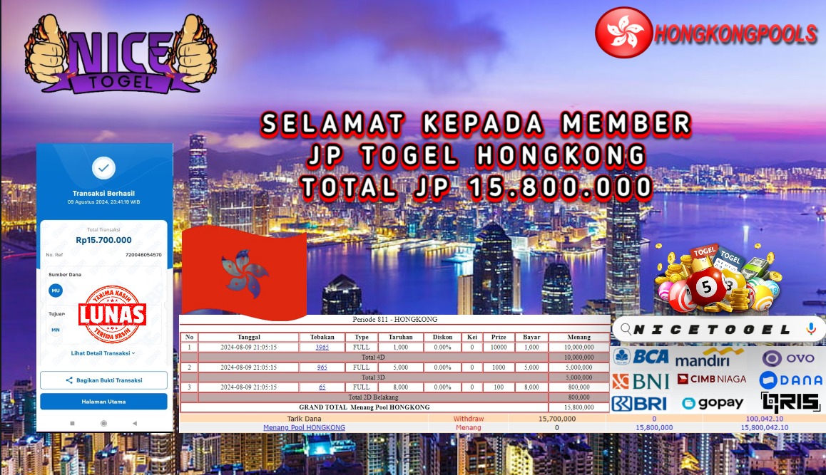 Selamat kepada User id : l** Telah berhasil mendapatkan kemenangan besar pada permainan HONGKONG POOLS Dengan kemenangan Sebesar Rp.15.800.000,- Setelah mengisi formulir withdraw dengan kurung waktu hanya 5 – 10 menit pihak NICETOGEL sudah melakukan transfer kepada pemilik Userid dan dana sudah dapat di cairkan oleh pemenang. Bukti pembayaran yang kami berikan merupakan bukti pembayaran yang SAH / VALID yang langung di dapatkan melaui tanda transfer transaksi dari Bank yang di tuju.