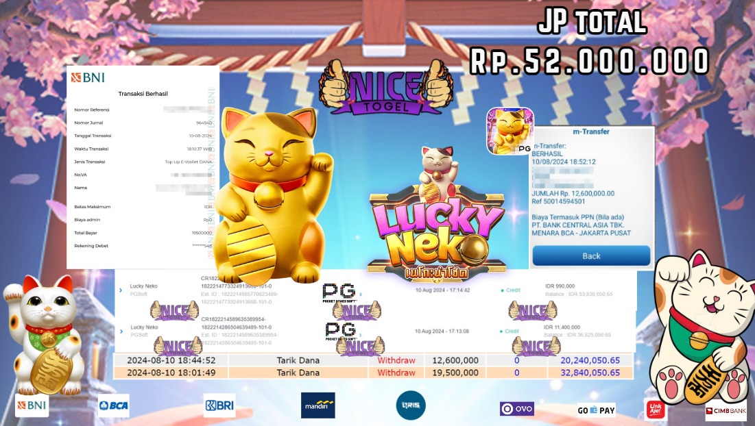 Selamat kepada User id : CARE** Telah berhasil mendapatkan kemenangan besar pada permainan LUCKY NEKO Dengan kemenangan Sebesar Rp.52.000.000,- Setelah mengisi formulir withdraw dengan kurung waktu hanya 5 – 10 menit pihak NICETOGEL sudah melakukan transfer kepada pemilik Userid dan dana sudah dapat di cairkan oleh pemenang. Bukti pembayaran yang kami berikan merupakan bukti pembayaran yang SAH / VALID yang langung di dapatkan melaui tanda transfer transaksi dari Bank yang di tuju.