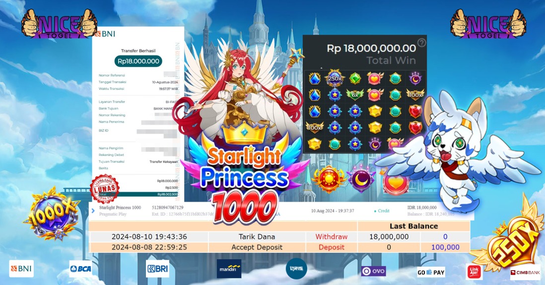 Selamat kepada User id : Kaji** Telah berhasil mendapatkan kemenangan besar pada permainan STARLIGHT PRINCESS 1000 Dengan kemenangan Sebesar Rp.18.000.000,- Setelah mengisi formulir withdraw dengan kurung waktu hanya 5 – 10 menit pihak NICETOGEL sudah melakukan transfer kepada pemilik Userid dan dana sudah dapat di cairkan oleh pemenang. Bukti pembayaran yang kami berikan merupakan bukti pembayaran yang SAH / VALID yang langung di dapatkan melaui tanda transfer transaksi dari Bank yang di tuju.