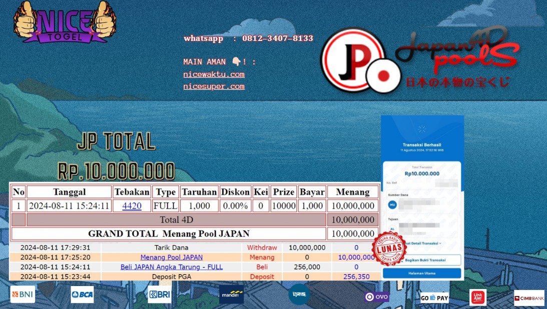 Selamat kepada User id : Roh12** Telah berhasil mendapatkan kemenangan besar pada permainan TOGEL JAPAN POOLS Dengan kemenangan Sebesar Rp.10.000.000,- Setelah mengisi formulir withdraw dengan kurung waktu hanya 5 – 10 menit pihak NICETOGEL sudah melakukan transfer kepada pemilik Userid dan dana sudah dapat di cairkan oleh pemenang. Bukti pembayaran yang kami berikan merupakan bukti pembayaran yang SAH / VALID yang langung di dapatkan melaui tanda transfer transaksi dari Bank yang di tuju.