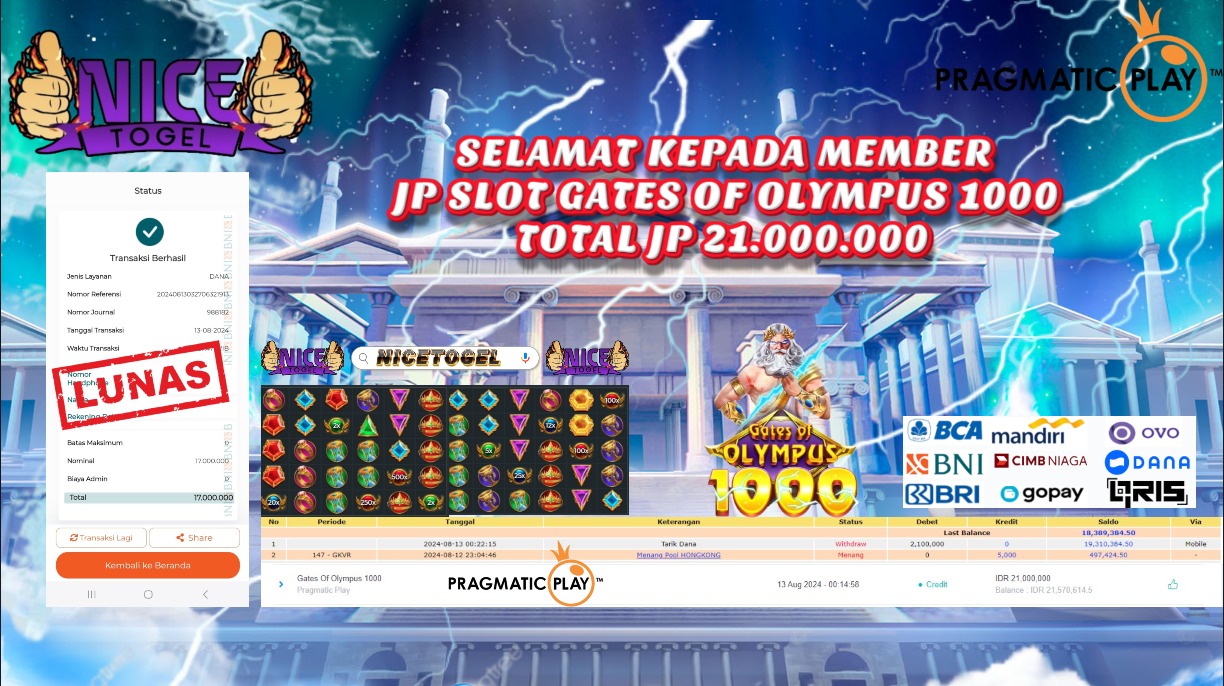 Selamat kepada User id : bass** Telah berhasil mendapatkan kemenangan besar pada permainan GATES OF OLYMPUS 1000  Dengan kemenangan Sebesar Rp.21.000.000,- Setelah mengisi formulir withdraw dengan kurung waktu hanya 5 – 10 menit pihak NICETOGEL sudah melakukan transfer kepada pemilik Userid dan dana sudah dapat di cairkan oleh pemenang. Bukti pembayaran yang kami berikan merupakan bukti pembayaran yang SAH / VALID yang langung di dapatkan melaui tanda transfer transaksi dari Bank yang di tuju.