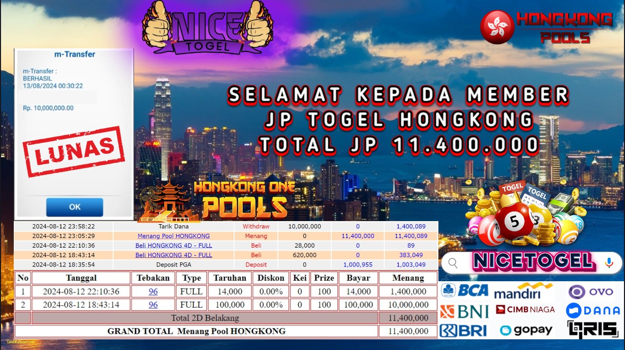 Selamat kepada User id : usm**** Telah berhasil mendapatkan kemenangan besar pada permainan TOGEL HONGKONG POOLS Dengan kemenangan Sebesar Rp.11.400.000,- Setelah mengisi formulir withdraw dengan kurung waktu hanya 5 – 10 menit pihak NICETOGEL sudah melakukan transfer kepada pemilik Userid dan dana sudah dapat di cairkan oleh pemenang. Bukti pembayaran yang kami berikan merupakan bukti pembayaran yang SAH / VALID yang langung di dapatkan melaui tanda transfer transaksi dari Bank yang di tuju.