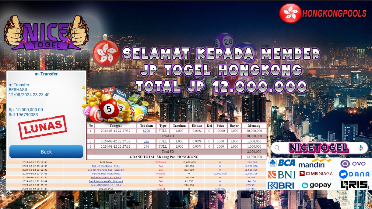 Selamat kepada User id : Us** Telah berhasil mendapatkan kemenangan besar pada permainan TOGEL HONGKONG POOLS Dengan kemenangan Sebesar Rp.12.000.000,- Setelah mengisi formulir withdraw dengan kurung waktu hanya 5 – 10 menit pihak NICETOGEL sudah melakukan transfer kepada pemilik Userid dan dana sudah dapat di cairkan oleh pemenang. Bukti pembayaran yang kami berikan merupakan bukti pembayaran yang SAH / VALID yang langung di dapatkan melaui tanda transfer transaksi dari Bank yang di tuju.