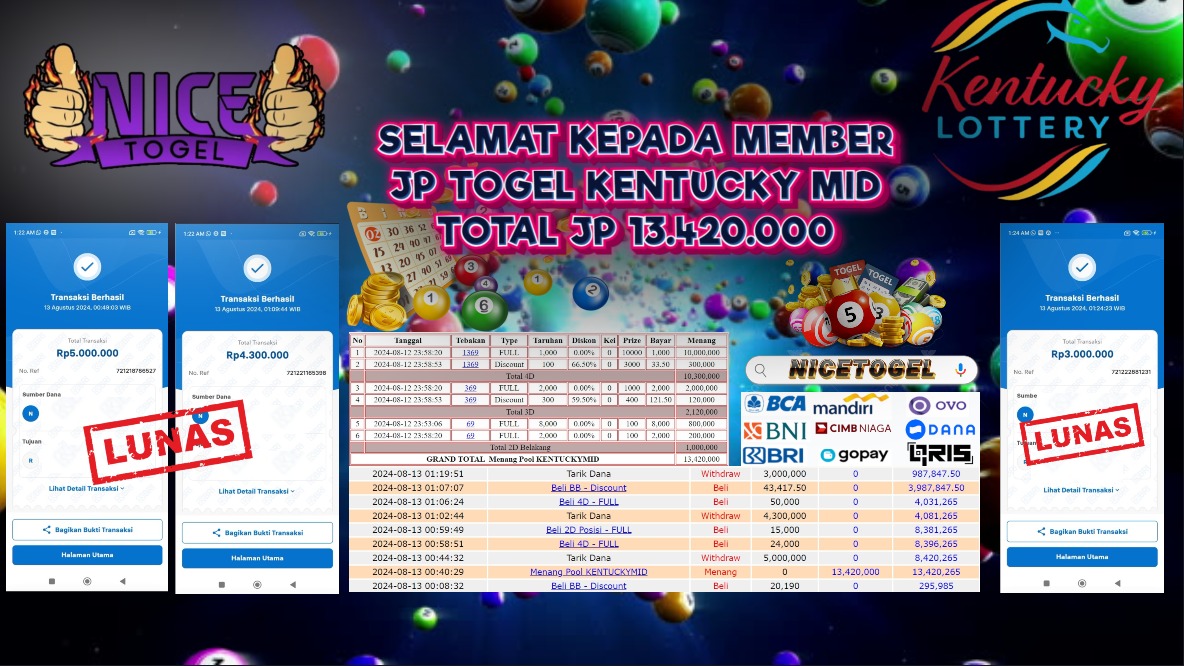 Selamat kepada User id : s** Telah berhasil mendapatkan kemenangan besar pada permainan TOGEL KENTUCKY MID POOLS Dengan kemenangan Sebesar Rp.13.420.000,- Setelah mengisi formulir withdraw dengan kurung waktu hanya 5 – 10 menit pihak NICETOGEL sudah melakukan transfer kepada pemilik Userid dan dana sudah dapat di cairkan oleh pemenang. Bukti pembayaran yang kami berikan merupakan bukti pembayaran yang SAH / VALID yang langung di dapatkan melaui tanda transfer transaksi dari Bank yang di tuju.