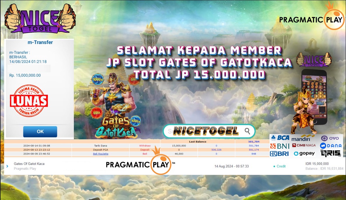 Selamat kepada User id : can*** Telah berhasil mendapatkan kemenangan besar pada permainan GATES GATOTKACA Dengan kemenangan Sebesar Rp.15.000.000,- Setelah mengisi formulir withdraw dengan kurung waktu hanya 5 – 10 menit pihak NICETOGEL sudah melakukan transfer kepada pemilik Userid dan dana sudah dapat di cairkan oleh pemenang. Bukti pembayaran yang kami berikan merupakan bukti pembayaran yang SAH / VALID yang langung di dapatkan melaui tanda transfer transaksi dari Bank yang di tuju.