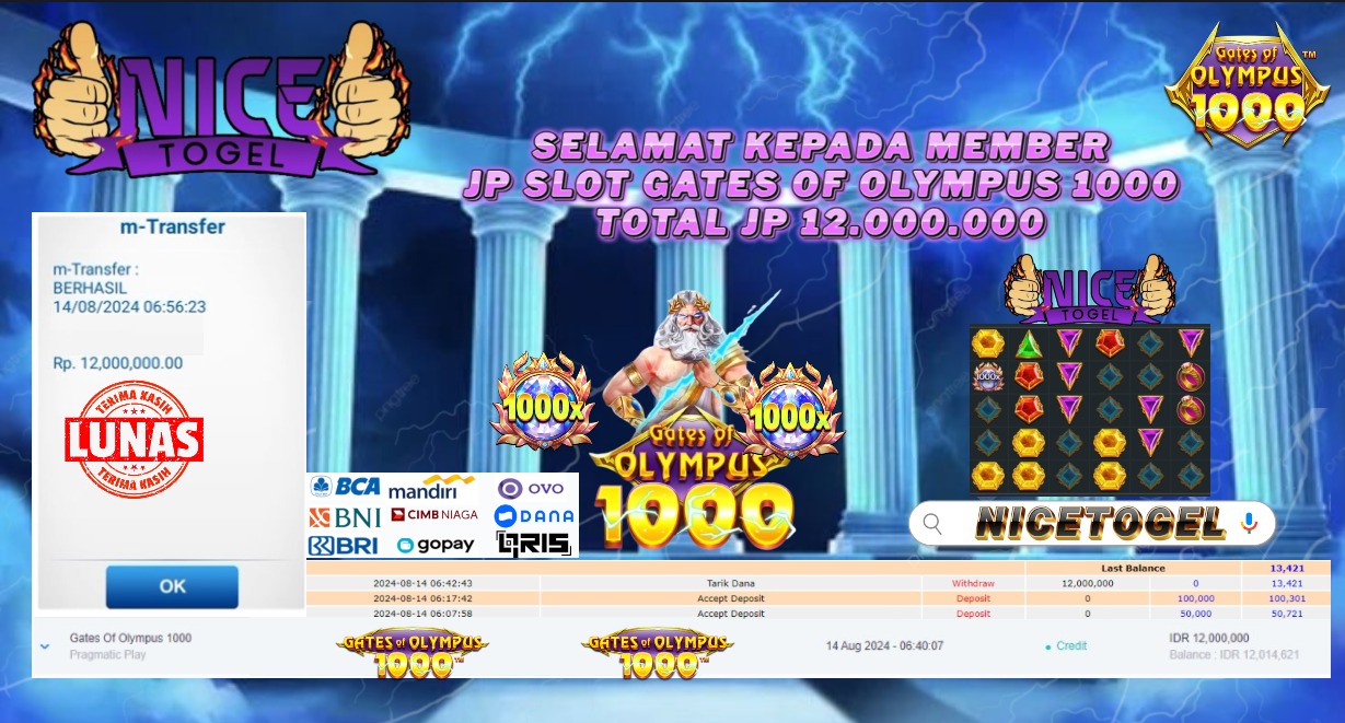 Selamat kepada User id : san6*** Telah berhasil mendapatkan kemenangan besar pada permainan GATES OF OLYMPUS 1000  Dengan kemenangan Sebesar Rp.12.000.000,- Setelah mengisi formulir withdraw dengan kurung waktu hanya 5 – 10 menit pihak NICETOGEL sudah melakukan transfer kepada pemilik Userid dan dana sudah dapat di cairkan oleh pemenang. Bukti pembayaran yang kami berikan merupakan bukti pembayaran yang SAH / VALID yang langung di dapatkan melaui tanda transfer transaksi dari Bank yang di tuju.