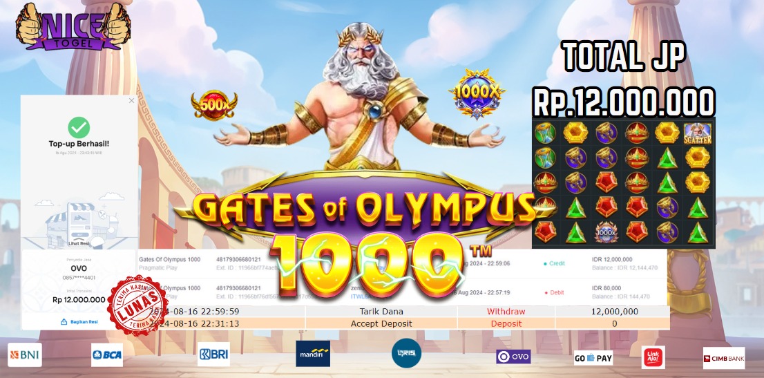 Selamat kepada User id : Ruop** Telah berhasil mendapatkan kemenangan besar pada permainan GATES OF OLYMPUS 1000 Dengan kemenangan Sebesar Rp.12.000.000,- Setelah mengisi formulir withdraw dengan kurung waktu hanya 5 – 10 menit pihak NICETOGEL sudah melakukan transfer kepada pemilik Userid dan dana sudah dapat di cairkan oleh pemenang. Bukti pembayaran yang kami berikan merupakan bukti pembayaran yang SAH / VALID yang langung di dapatkan melaui tanda transfer transaksi dari Bank yang di tuju.