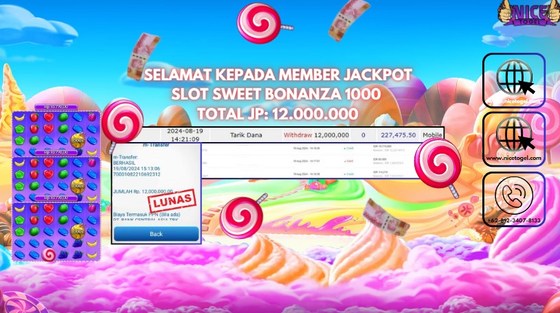 Selamat kepada User id : khe***8 Telah berhasil mendapatkan kemenangan besar pada permainan SLOT SWEET BONANZA 1000 Dengan kemenangan Sebesar Rp.12.000.000,- Setelah mengisi formulir withdraw dengan kurung waktu hanya 5 – 10 menit pihak NICETOGEL sudah melakukan transfer kepada pemilik Userid dan dana sudah dapat di cairkan oleh pemenang. Bukti pembayaran yang kami berikan merupakan bukti pembayaran yang SAH / VALID yang langung di dapatkan melaui tanda transfer transaksi dari Bank yang di tuju.