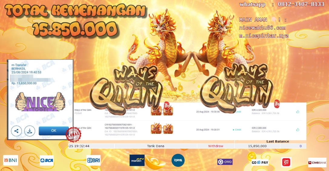 Selamat kepada User id : Wert** Telah berhasil mendapatkan kemenangan besar pada permainan SLOT WAYS OF THE QILIN Dengan kemenangan Sebesar Rp.15.850.000,- Setelah mengisi formulir withdraw dengan kurung waktu hanya 5 – 10 menit pihak NICETOGEL sudah melakukan transfer kepada pemilik Userid dan dana sudah dapat di cairkan oleh pemenang. Bukti pembayaran yang kami berikan merupakan bukti pembayaran yang SAH / VALID yang langung di dapatkan melaui tanda transfer transaksi dari Bank yang di tuju.