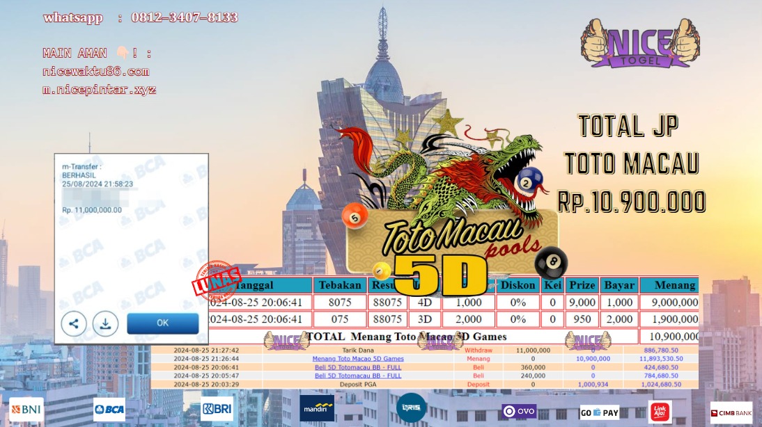 Selamat kepada User id : Pol** Telah berhasil mendapatkan kemenangan besar pada permainan TOTO MACAU 5D Dengan kemenangan Sebesar Rp.10.900.000,- Setelah mengisi formulir withdraw dengan kurung waktu hanya 5 – 10 menit pihak NICETOGEL sudah melakukan transfer kepada pemilik Userid dan dana sudah dapat di cairkan oleh pemenang. Bukti pembayaran yang kami berikan merupakan bukti pembayaran yang SAH / VALID yang langung di dapatkan melaui tanda transfer transaksi dari Bank yang di tuju.