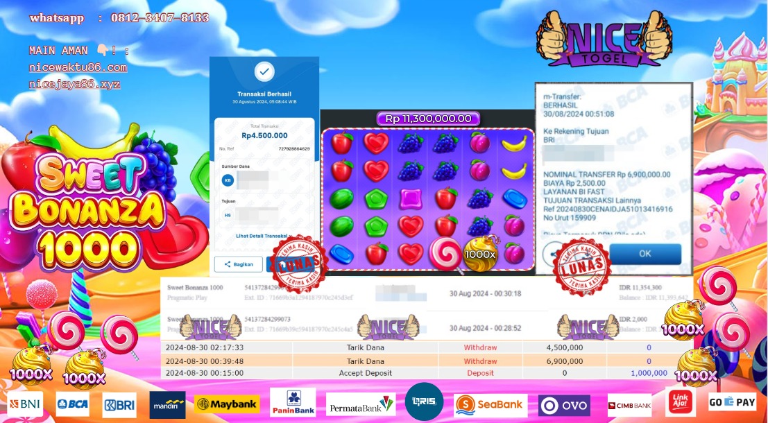 Selamat kepada User id : Niak** Telah berhasil mendapatkan kemenangan besar pada permainan SLOT SWEET BONANZA1000  Dengan kemenangan Sebesar Rp.11.300.000,- Setelah mengisi formulir withdraw dengan kurung waktu hanya 5 – 10 menit pihak NICETOGEL sudah melakukan transfer kepada pemilik Userid dan dana sudah dapat di cairkan oleh pemenang. Bukti pembayaran yang kami berikan merupakan bukti pembayaran yang SAH / VALID yang langung di dapatkan melaui tanda transfer transaksi dari Bank yang di tuju.