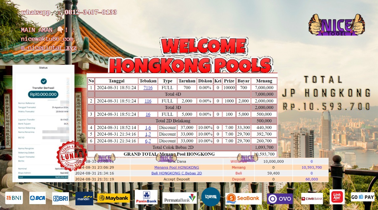 Selamat kepada User id : Reaas** Telah berhasil mendapatkan kemenangan besar pada permainan TOGEL HONGKONG POOLS Dengan kemenangan Sebesar Rp.10.593.700,- Setelah mengisi formulir withdraw dengan kurung waktu hanya 5 – 10 menit pihak NICETOGEL sudah melakukan transfer kepada pemilik Userid dan dana sudah dapat di cairkan oleh pemenang. Bukti pembayaran yang kami berikan merupakan bukti pembayaran yang SAH / VALID yang langung di dapatkan melaui tanda transfer transaksi dari Bank yang di tuju.