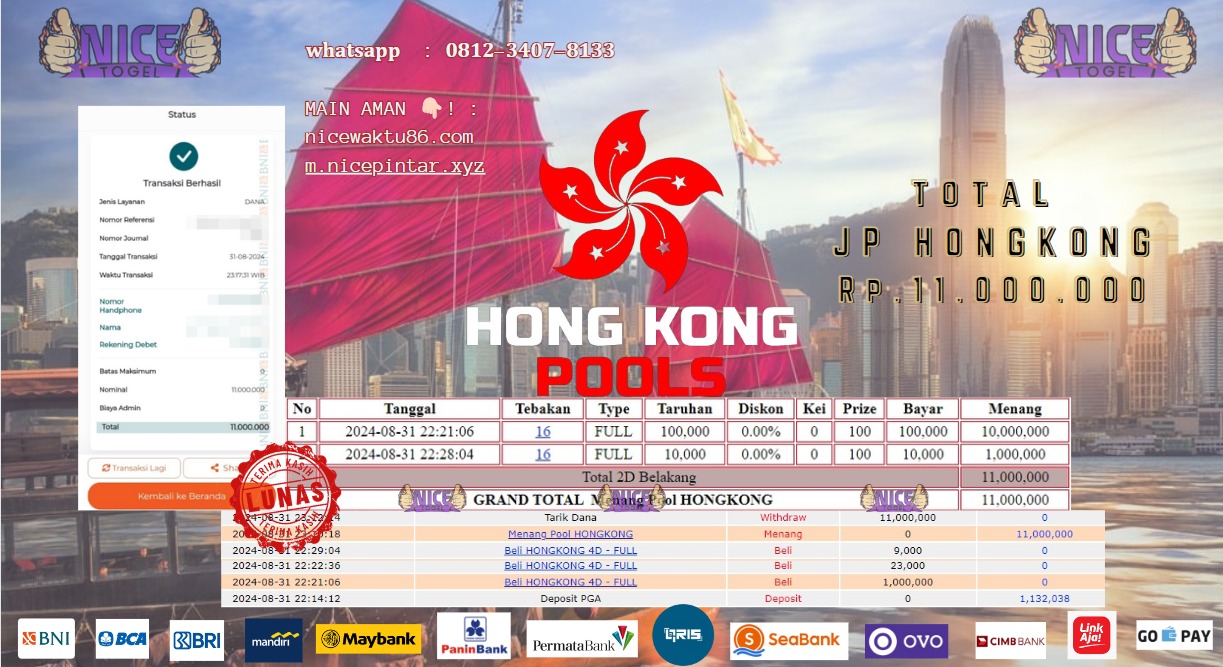 Selamat kepada User id : Hjoe** Telah berhasil mendapatkan kemenangan besar pada permainan TOGEL HONGKONG POOLS Dengan kemenangan Sebesar Rp.11.000.000,- Setelah mengisi formulir withdraw dengan kurung waktu hanya 5 – 10 menit pihak NICETOGEL sudah melakukan transfer kepada pemilik Userid dan dana sudah dapat di cairkan oleh pemenang. Bukti pembayaran yang kami berikan merupakan bukti pembayaran yang SAH / VALID yang langung di dapatkan melaui tanda transfer transaksi dari Bank yang di tuju.