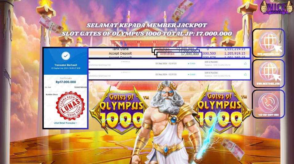 Selamat kepada User id : GUS**** Telah berhasil mendapatkan kemenangan besar pada permainan SLOT GATES OF OLYMPUS 1000 Dengan kemenangan Sebesar Rp.17.000.000,- Setelah mengisi formulir withdraw dengan kurung waktu hanya 5 – 10 menit pihak NICETOGEL sudah melakukan transfer kepada pemilik Userid dan dana sudah dapat di cairkan oleh pemenang. Bukti pembayaran yang kami berikan merupakan bukti pembayaran yang SAH / VALID yang langung di dapatkan melaui tanda transfer transaksi dari Bank yang di tuju.