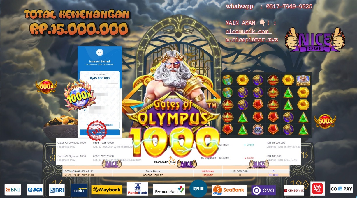 Selamat kepada User id : TOPET** Telah berhasil mendapatkan kemenangan besar pada permainan GATES OF OLYMPUS 1000  Dengan kemenangan Sebesar Rp.15.000.000,- Setelah mengisi formulir withdraw dengan kurung waktu hanya 5 – 10 menit pihak NICETOGEL sudah melakukan transfer kepada pemilik Userid dan dana sudah dapat di cairkan oleh pemenang. Bukti pembayaran yang kami berikan merupakan bukti pembayaran yang SAH / VALID yang langung di dapatkan melaui tanda transfer transaksi dari Bank yang di tuju.