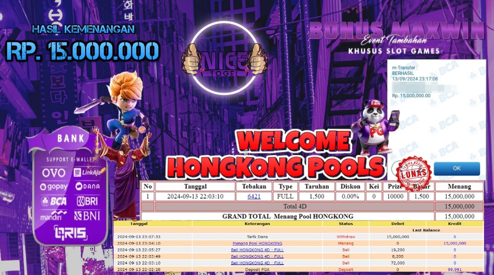 Selamat kepada User id : Alio1** Telah berhasil mendapatkan kemenangan besar pada permainan Togel HONGKONG POOLS Dengan kemenangan Sebesar Rp.15.000.000,- Setelah mengisi formulir withdraw dengan kurung waktu hanya 5 – 10 menit pihak NICETOGEL sudah melakukan transfer kepada pemilik Userid dan dana sudah dapat di cairkan oleh pemenang. Bukti pembayaran yang kami berikan merupakan bukti pembayaran yang SAH / VALID yang langung di dapatkan melaui tanda transfer transaksi dari Bank yang di tuju.