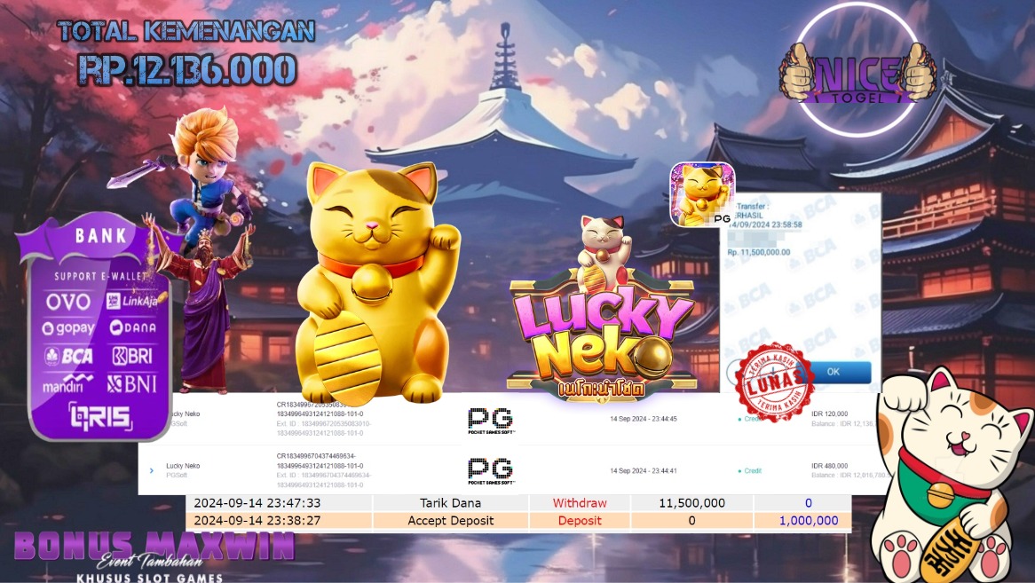 Selamat kepada User id : Opes** Telah berhasil mendapatkan kemenangan besar pada permainan SLOT LUCKY NEKO Dengan kemenangan Sebesar Rp.12.136.000,- Setelah mengisi formulir withdraw dengan kurung waktu hanya 5 – 10 menit pihak NICETOGEL sudah melakukan transfer kepada pemilik Userid dan dana sudah dapat di cairkan oleh pemenang. Bukti pembayaran yang kami berikan merupakan bukti pembayaran yang SAH / VALID yang langung di dapatkan melaui tanda transfer transaksi dari Bank yang di tuju.