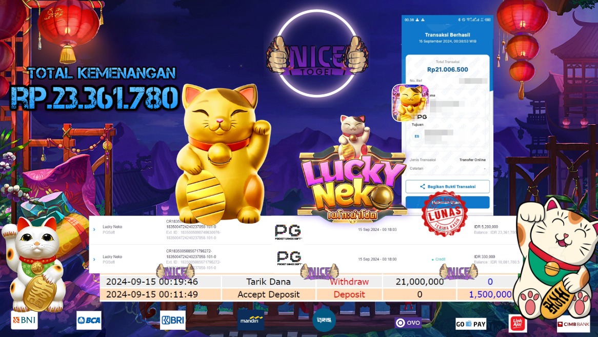 Selamat kepada User id : gus90** Telah berhasil mendapatkan kemenangan besar pada permainan SLOT LUCKY NEKO Dengan kemenangan Sebesar Rp 23.361.780,- Setelah mengisi formulir withdraw dengan kurung waktu hanya 5 – 10 menit pihak NICETOGEL sudah melakukan transfer kepada pemilik Userid dan dana sudah dapat di cairkan oleh pemenang. Bukti pembayaran yang kami berikan merupakan bukti pembayaran yang SAH / VALID yang langung di dapatkan melaui tanda transfer transaksi dari Bank yang di tuju.