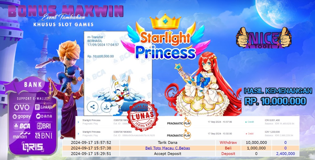 Selamat kepada User id : Eew36** Telah berhasil mendapatkan kemenangan besar pada permainan SLOT STARLIGHT PRINCESS Dengan kemenangan Sebesar Rp.10.000.000,- Setelah mengisi formulir withdraw dengan kurung waktu hanya 5 – 10 menit pihak NICETOGEL sudah melakukan transfer kepada pemilik Userid dan dana sudah dapat di cairkan oleh pemenang. Bukti pembayaran yang kami berikan merupakan bukti pembayaran yang SAH / VALID yang langung di dapatkan melaui tanda transfer transaksi dari Bank yang di tuju.
