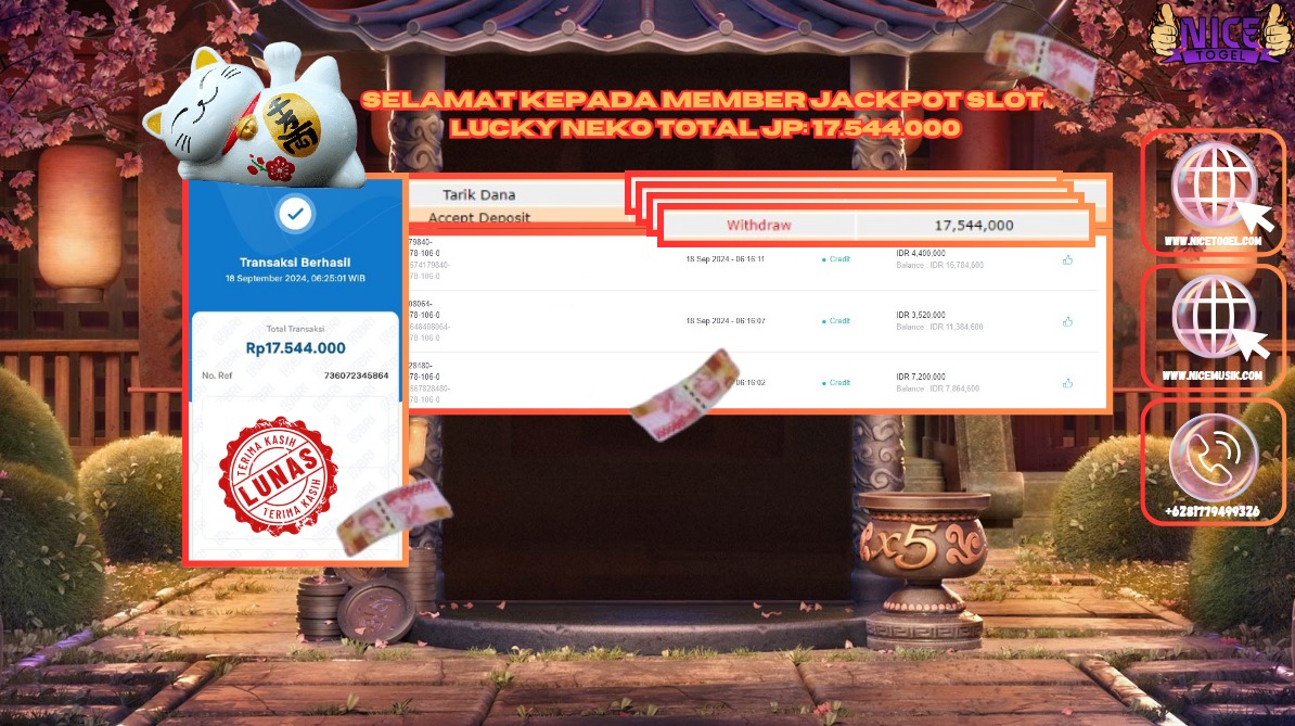 Selamat kepada User id : dan** Telah berhasil mendapatkan kemenangan besar pada permainan SLOT LUCKY NEKO Dengan kemenangan Sebesar Rp17.544.000,- Setelah mengisi formulir withdraw dengan kurung waktu hanya 5 – 10 menit pihak NICETOGEL sudah melakukan transfer kepada pemilik Userid dan dana sudah dapat di cairkan oleh pemenang. Bukti pembayaran yang kami berikan merupakan bukti pembayaran yang SAH / VALID yang langung di dapatkan melaui tanda transfer transaksi dari Bank yang di tuju.