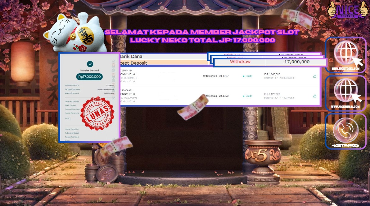 Selamat kepada User id : wul*** Telah berhasil mendapatkan kemenangan besar pada permainan SLOT LUCKY NEKO Dengan kemenangan Sebesar Rp.17.000.000,- Setelah mengisi formulir withdraw dengan kurung waktu hanya 5 – 10 menit pihak NICETOGEL sudah melakukan transfer kepada pemilik Userid dan dana sudah dapat di cairkan oleh pemenang. Bukti pembayaran yang kami berikan merupakan bukti pembayaran yang SAH / VALID yang langung di dapatkan melaui tanda transfer transaksi dari Bank yang di tuju.