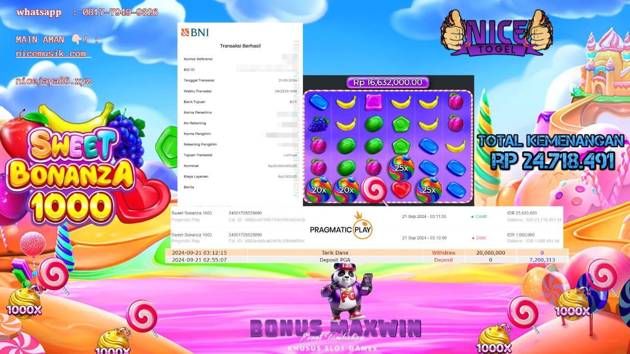 Selamat kepada User id : Ter58** Telah berhasil mendapatkan kemenangan besar pada permainan SLOT SWEET BONANZA 1000 Dengan kemenangan Sebesar Rp.24.718.491,- Setelah mengisi formulir withdraw dengan kurung waktu hanya 5 – 10 menit pihak NICETOGEL sudah melakukan transfer kepada pemilik Userid dan dana sudah dapat di cairkan oleh pemenang. Bukti pembayaran yang kami berikan merupakan bukti pembayaran yang SAH / VALID yang langung di dapatkan melaui tanda transfer transaksi dari Bank yang di tuju.