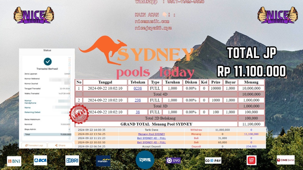 Selamat kepada User id : Ype25** Telah berhasil mendapatkan kemenangan besar pada permainan TOGEL SYDNEY Dengan kemenangan Sebesar Rp.11.100.000,- Setelah mengisi formulir withdraw dengan kurung waktu hanya 5 – 10 menit pihak NICETOGEL sudah melakukan transfer kepada pemilik Userid dan dana sudah dapat di cairkan oleh pemenang. Bukti pembayaran yang kami berikan merupakan bukti pembayaran yang SAH / VALID yang langung di dapatkan melaui tanda transfer transaksi dari Bank yang di tuju.