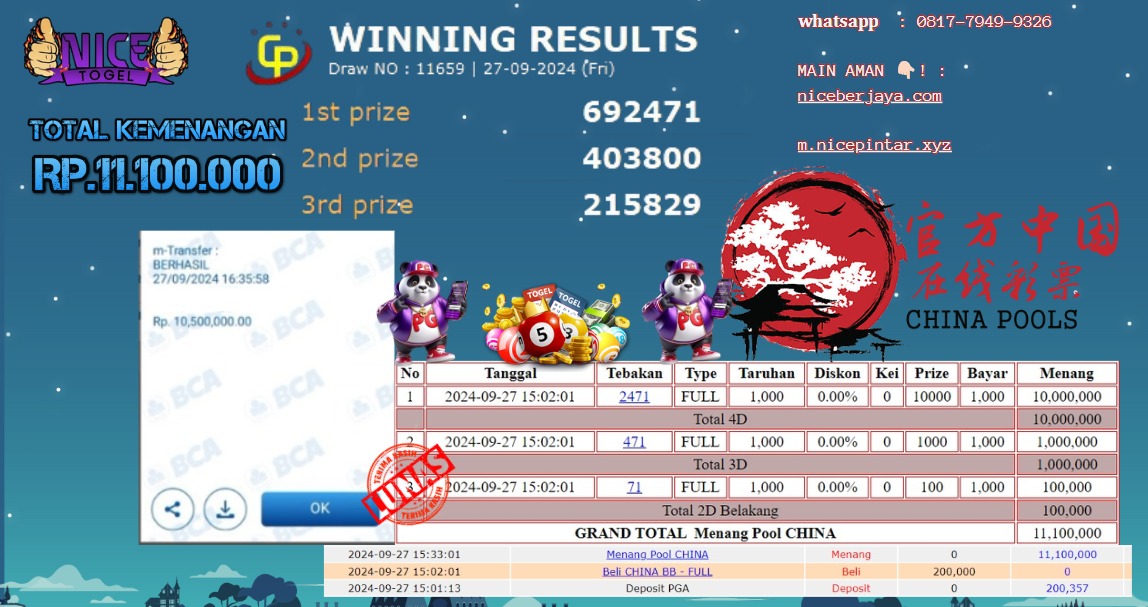 Selamat kepada User id : Pols523** Telah berhasil mendapatkan kemenangan besar pada permainan TOGEL CHINA POOLS Dengan kemenangan Sebesar Rp.11.100.000,- Setelah mengisi formulir withdraw dengan kurung waktu hanya 5 – 10 menit pihak NICETOGEL sudah melakukan transfer kepada pemilik Userid dan dana sudah dapat di cairkan oleh pemenang. Bukti pembayaran yang kami berikan merupakan bukti pembayaran yang SAH / VALID yang langung di dapatkan melaui tanda transfer transaksi dari Bank yang di tuju.