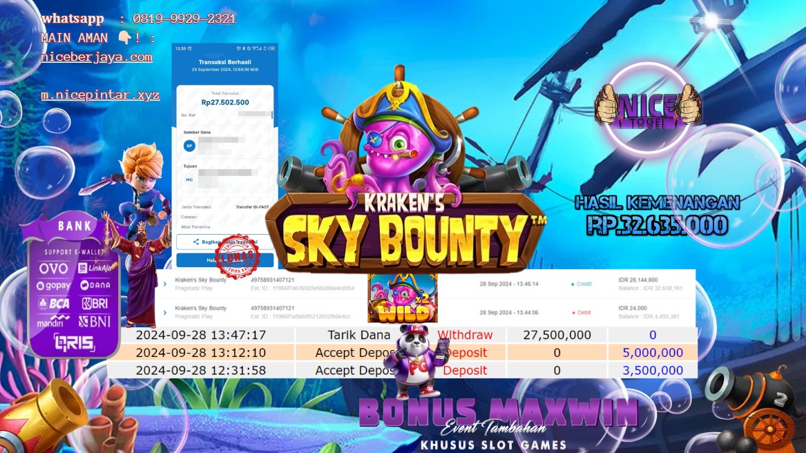 Selamat kepada User id : AS465** Telah berhasil mendapatkan kemenangan besar pada permainan SLOT KREAKEN SKY BOUNTY Dengan kemenangan Sebesar Rp.32.635.000,- Setelah mengisi formulir withdraw dengan kurung waktu hanya 5 – 10 menit pihak NICETOGEL sudah melakukan transfer kepada pemilik Userid dan dana sudah dapat di cairkan oleh pemenang. Bukti pembayaran yang kami berikan merupakan bukti pembayaran yang SAH / VALID yang langung di dapatkan melaui tanda transfer transaksi dari Bank yang di tuju.