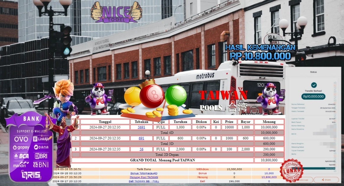 Selamat kepada User id : Oud58** Telah berhasil mendapatkan kemenangan besar pada permainan TOGEL TAIWAN Dengan kemenangan Sebesar Rp.10.800.000,- Setelah mengisi formulir withdraw dengan kurung waktu hanya 5 – 10 menit pihak NICETOGEL sudah melakukan transfer kepada pemilik Userid dan dana sudah dapat di cairkan oleh pemenang. Bukti pembayaran yang kami berikan merupakan bukti pembayaran yang SAH / VALID yang langung di dapatkan melaui tanda transfer transaksi dari Bank yang di tuju.