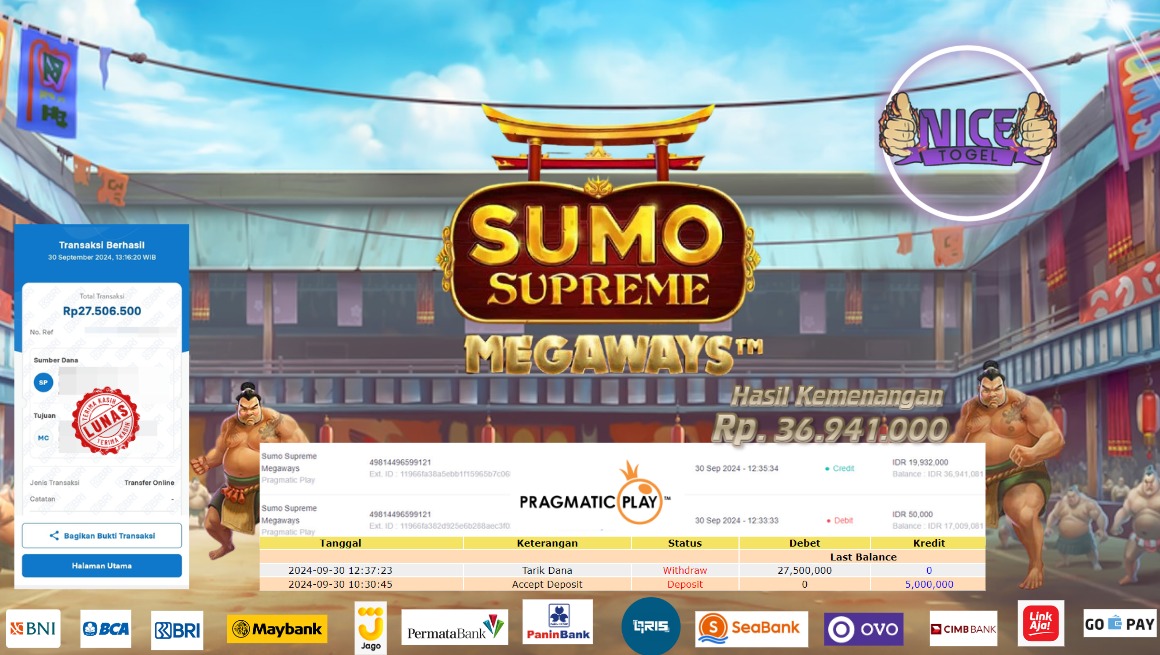 Selamat kepada User id : Biee52** Telah berhasil mendapatkan kemenangan besar pada permainan BUKTI JACKPOT SLOT SUMO SUPREME MEGAWAYS Dengan kemenangan Sebesar Rp.36.941.000,- LUNAS Setelah mengisi formulir withdraw dengan kurung waktu hanya 5 – 10 menit pihak NICETOGEL sudah melakukan transfer kepada pemilik Userid dan dana sudah dapat di cairkan oleh pemenang. Bukti pembayaran yang kami berikan merupakan bukti pembayaran yang SAH / VALID yang langung di dapatkan melaui tanda transfer transaksi dari Bank yang di tuju.