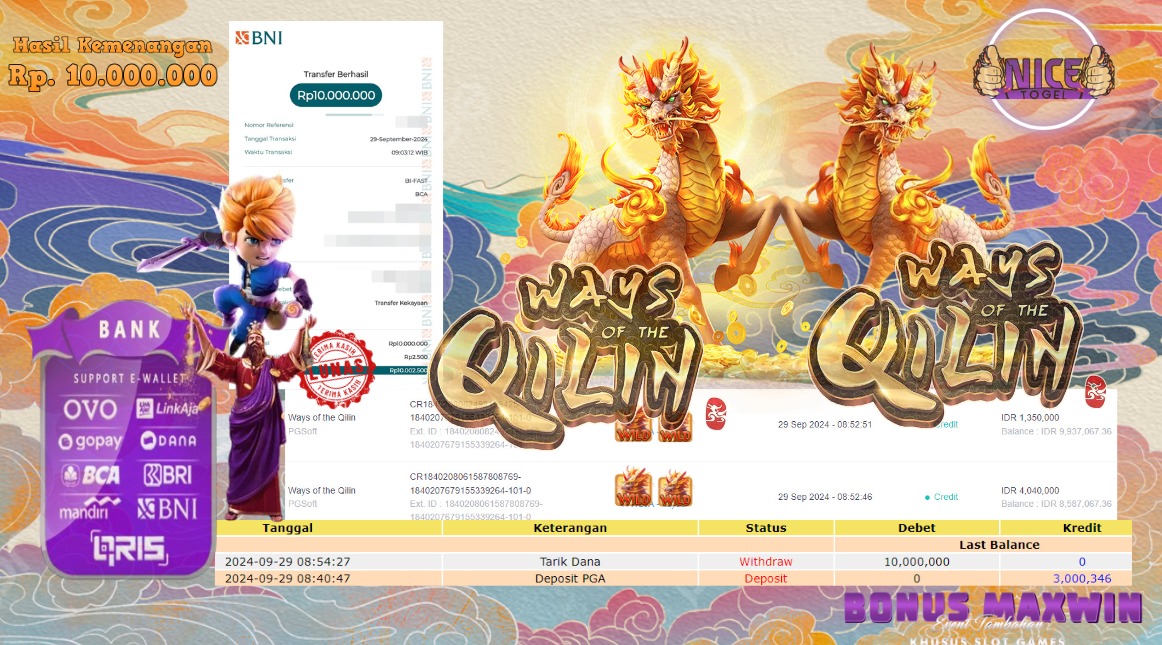 Selamat kepada User id : Youy98** Telah berhasil mendapatkan kemenangan besar pada permainan SLOT WAYS OF THE QILIN Dengan kemenangan Sebesar Rp.10.000.000,- Setelah mengisi formulir withdraw dengan kurung waktu hanya 5 – 10 menit pihak NICETOGEL sudah melakukan transfer kepada pemilik Userid dan dana sudah dapat di cairkan oleh pemenang. Bukti pembayaran yang kami berikan merupakan bukti pembayaran yang SAH / VALID yang langung di dapatkan melaui tanda transfer transaksi dari Bank yang di tuju.