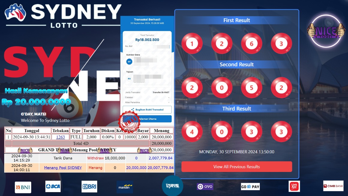 Selamat kepada User id : Komn22** Telah berhasil mendapatkan kemenangan besar pada permainan TOGEL SYDNEY LOTTO Dengan kemenangan Sebesar Rp.20.000.000,- Setelah mengisi formulir withdraw dengan kurung waktu hanya 5 – 10 menit pihak NICETOGEL sudah melakukan transfer kepada pemilik Userid dan dana sudah dapat di cairkan oleh pemenang. Bukti pembayaran yang kami berikan merupakan bukti pembayaran yang SAH / VALID yang langung di dapatkan melaui tanda transfer transaksi dari Bank yang di tuju.