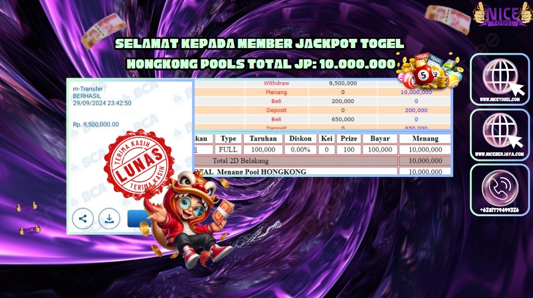 Selamat kepada User id : wall** Telah berhasil mendapatkan kemenangan besar pada permainan TOGEL HONGKONG Dengan kemenangan Sebesar Rp.10.000.000,- Setelah mengisi formulir withdraw dengan kurung waktu hanya 5 – 10 menit pihak NICETOGEL sudah melakukan transfer kepada pemilik Userid dan dana sudah dapat di cairkan oleh pemenang. Bukti pembayaran yang kami berikan merupakan bukti pembayaran yang SAH / VALID yang langung di dapatkan melaui tanda transfer transaksi dari Bank yang di tuju.