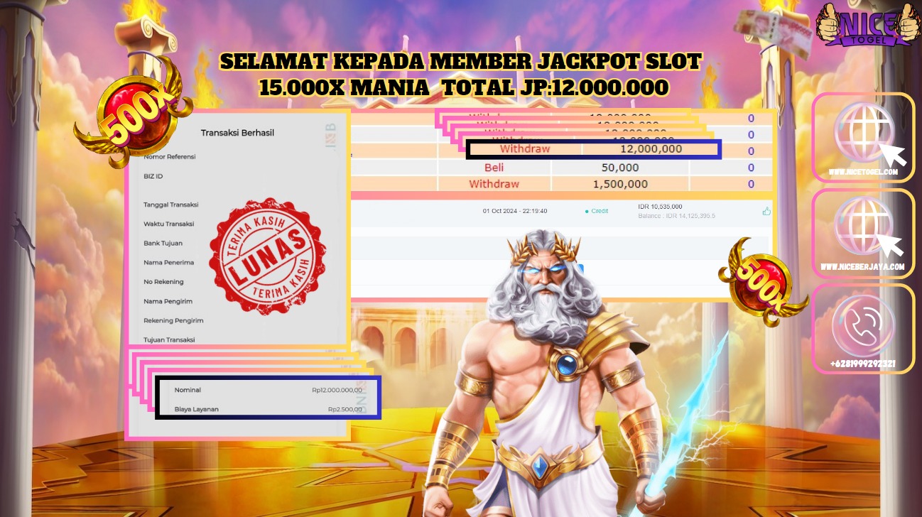 Selamat kepada User id : sul** Telah berhasil mendapatkan kemenangan besar pada permainan SLOT 15.000X MANIA Dengan kemenangan Sebesar Rp.12.000.000,- Setelah mengisi formulir withdraw dengan kurung waktu hanya 5 – 10 menit pihak NICETOGEL sudah melakukan transfer kepada pemilik Userid dan dana sudah dapat di cairkan oleh pemenang. Bukti pembayaran yang kami berikan merupakan bukti pembayaran yang SAH / VALID yang langung di dapatkan melaui tanda transfer transaksi dari Bank yang di tuju.